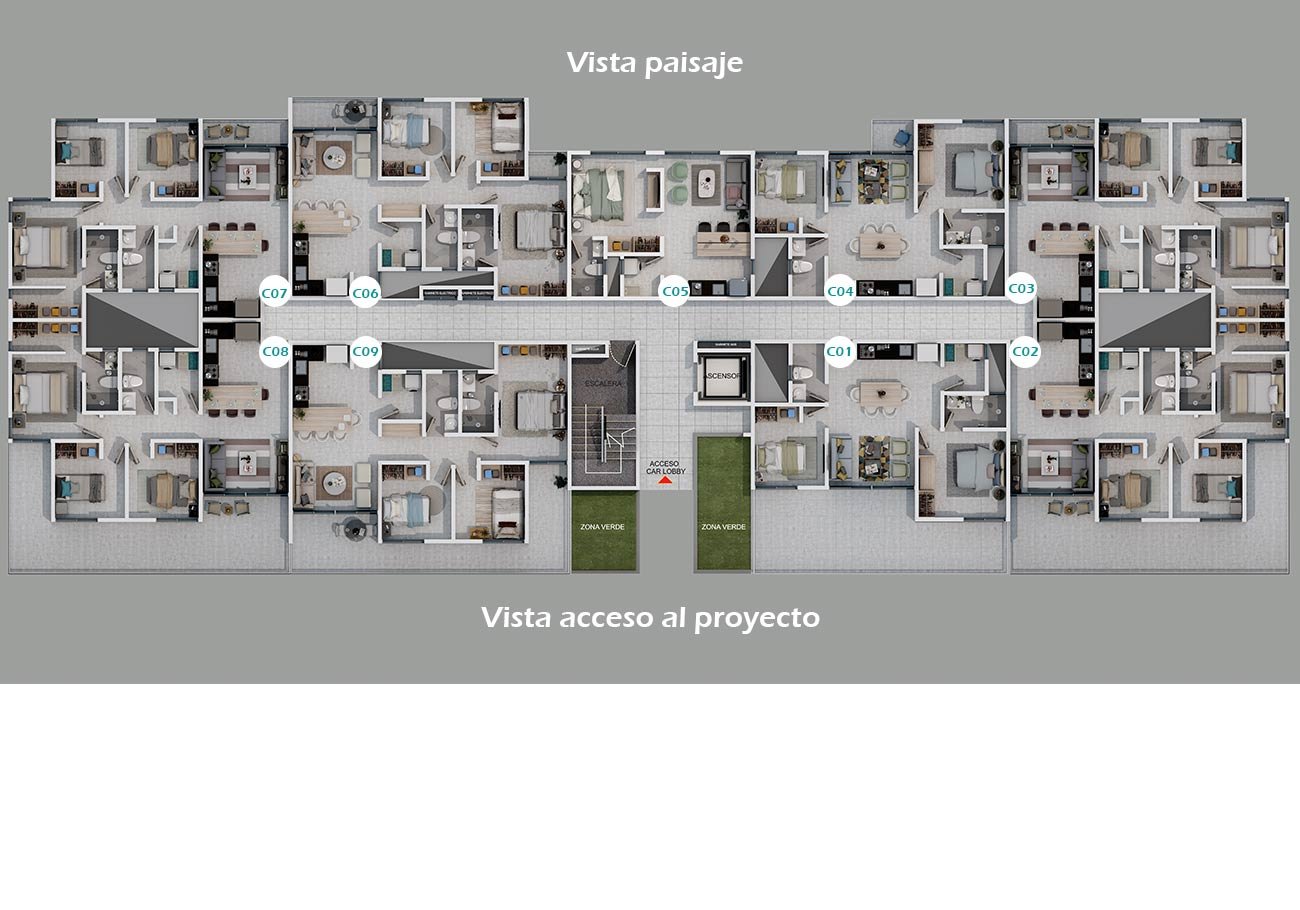 - Parqueaderos: Parqueaderos para residentes y visitantes