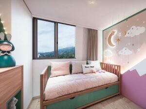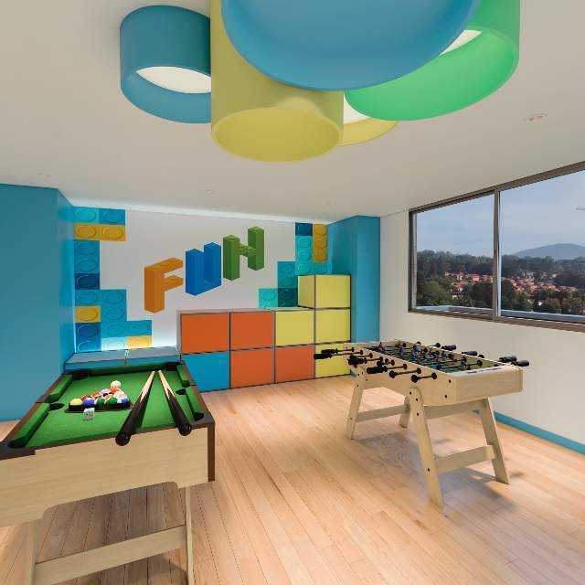- Amenidades: Zonas comunes para adultos: Sauna, Turco, Zona mascotas, Guardería mascotas, Salón billar, Club house, Taller de artes / cocina, Coworking, Herbario, Observatorio, Salón social, Portería, Parque público Zonas comunes para jóvenes: Cinema, Salón de yoga, Salón de juegos, Salón video juegos, Chimeneas, Sky lounge, Piscina adultos, Solarium, Gimnasio, Cancha sintética Zonas comunes para niños: Playground, Salón niños, Salón niñas, Baby gym, Terraza lúdica, Pista de triciclos, Juegos infantiles, Piscina niños