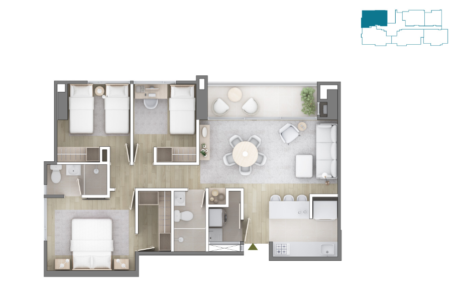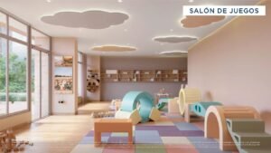 - Amenidades: Lobby, piscina para adultos y niños, carril de nado, sauna, turco, gimnasio al aire libre, juegos infantiles, salón múltiple, rincón de lectura, terraza de yoga, coworking, kids club, zona pet, cancha de pádel, social kitchen, salón de baile, play room y pista de triciclos.