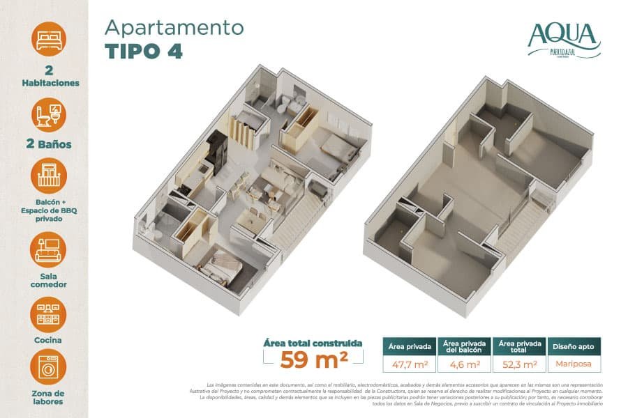 - Info Adicional: Areas entre 58.90 - 100.4 m² Con 2 habitaciones con 2 baños completos
