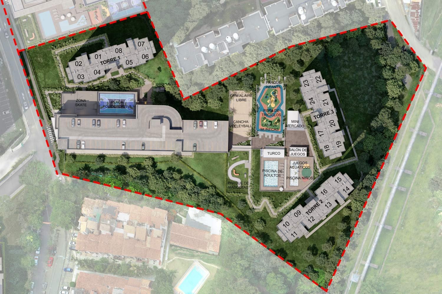 - Amenidades: ESTANCIASVERDES, PISCINA ADULTOS Y NIÑOS, ZONA HÚMEDA DE CHORROS, PLACA POLIDEPORTIVA, ZONA DE BBQ, TURCO Y SOLARIUM, JUEGOS INFANTILES, CANCHA DE VOLEY PLAYA, CASADE MUÑECAS, LOCAL COMERCIAL, ZONA DE SKATE, GIMNASIO SEMI-DOTADO, GIMNASIO AL AIRELIBRE, ZONA DE MASCOTAS, CIRCUITO DE TRICICLOS Y BICICLETAS, SALÓN DE VIDEO Y JUEGOS DE MESA, ZONA COWORKING, ESTANCIAS VERDES, SALON SOCIAL