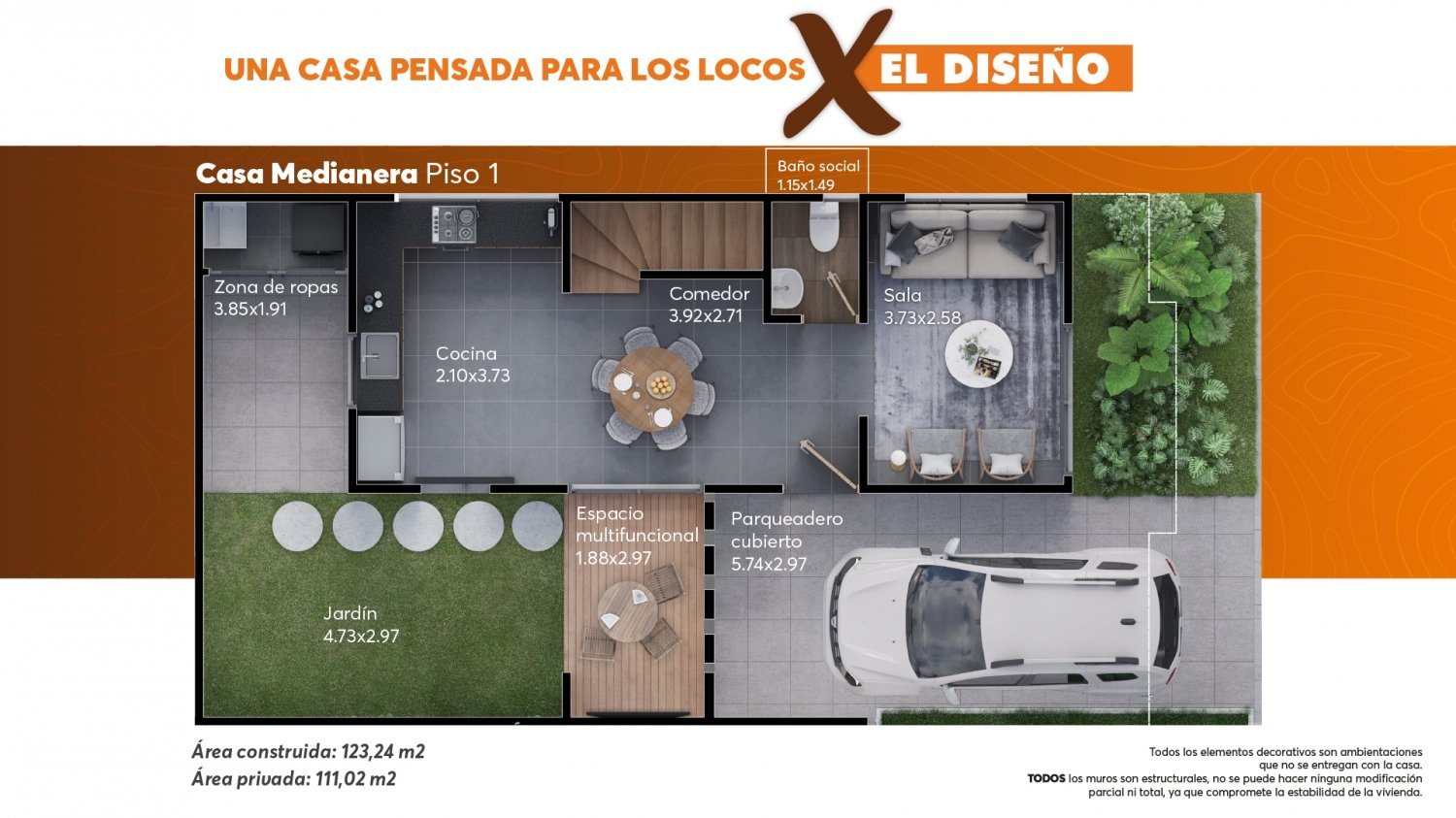 - Info Adicional: Casa Tipología: Medianera Área: 123.24 m2 Con 3 habitaciones: 3 Baños: 3.5 Áreas sociales: Sala comedor, Casas de 2 niveles, con espacio multifuncional en el piso 1, Patio y jardín